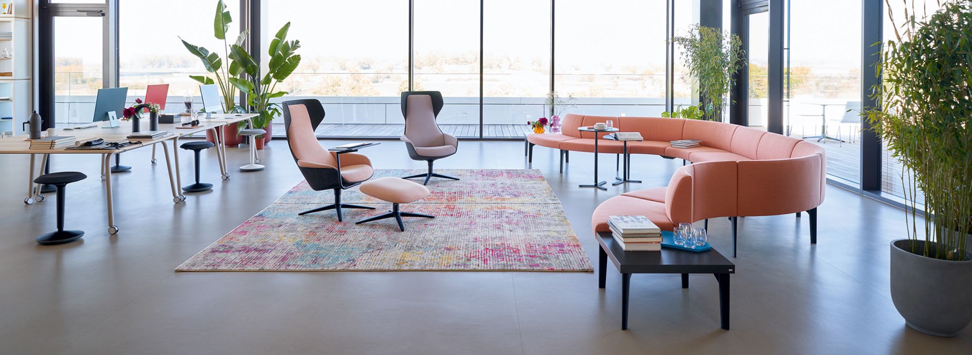 Individuell angepasste Designlösungen an die vorherrschenden Arbeiten, komfortable und flexible Möblierungen sowie akustisch wirksame Produkte, runden das Profil eines modernen Arbeitsplatzes im Eingangsbereich ab.